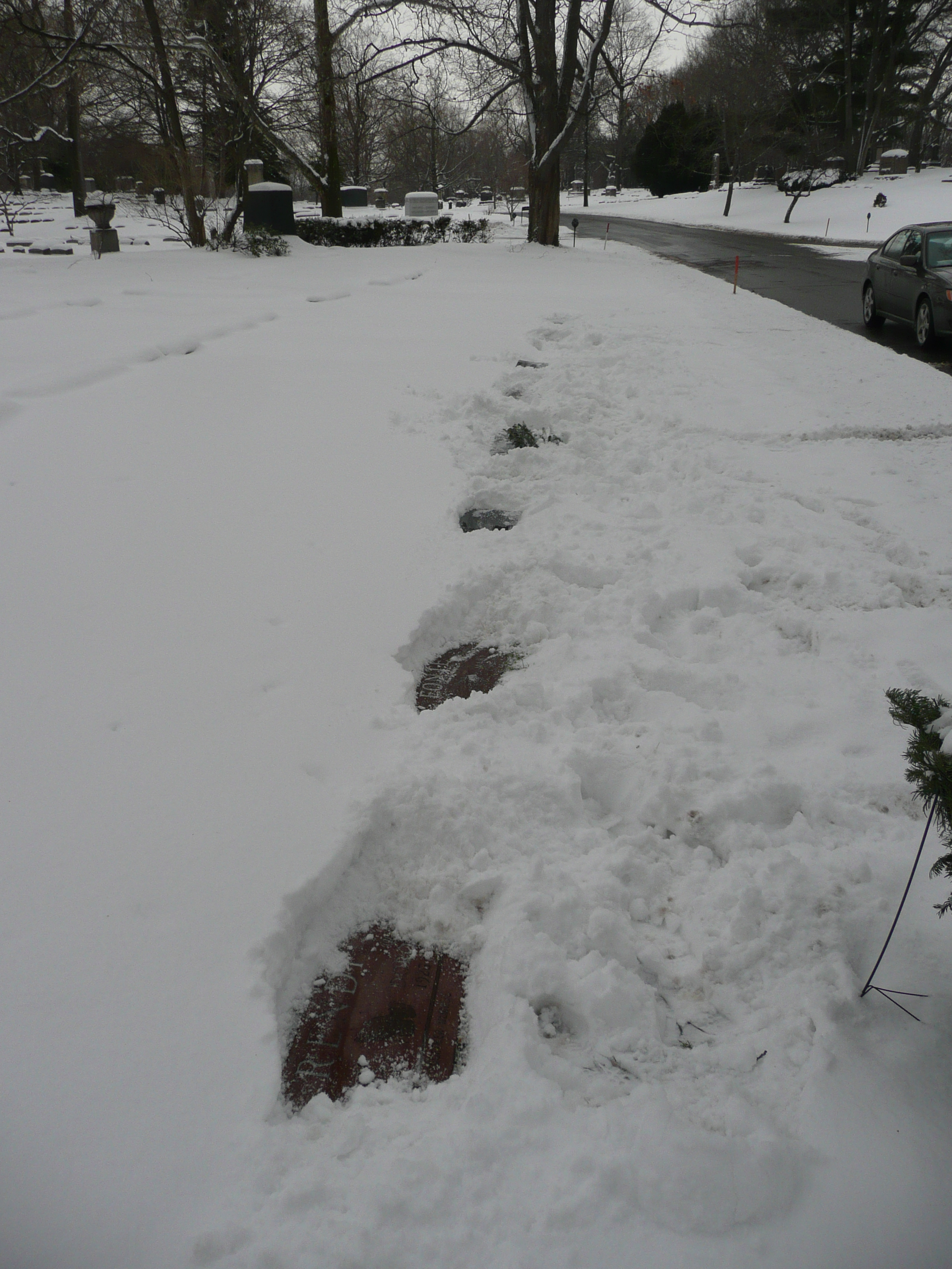 OK, I told you there would be more about Bocky later. Linda made it very clear that this trip was about us getting away and not about me doing research into Bocky’s murder. I agreed, but just to be safe she decreed that every time I said the “B-word” she would add $10 to the price of the cool gift she planned to find for herself. By the time we got to the retro sweater store in the late afternoon – after visiting Bocky’s grave and lunch with Wally and Vince – the kitty was plenty rich enough for her to buy a super-cool, knee-length sweater from the mid-1960s. Hey, she earned it. In fact, look how many headstones Linda had to sweep clean – nine, I didn’t bring my boots – before we hit the jackpot.