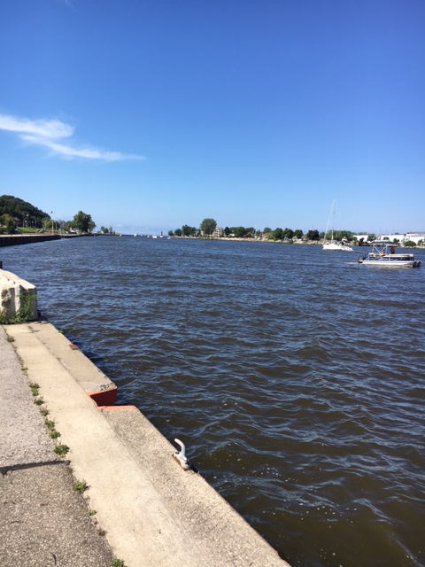 Looking down the last stretch of the Grand, to where it empties into Lake Michigan. Great Lakes freighters travel this part of the river, so it’s deep and wide.